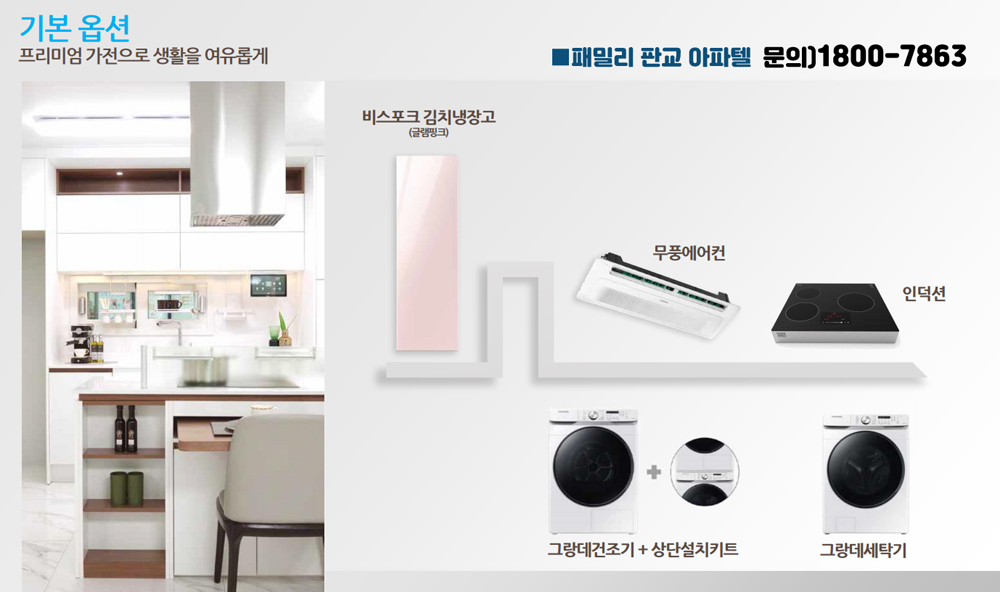 여기 패미리 판교 아파텔에서 기본 옵션으로 제공하는 빌트인 가전제품을 알아 보겠습니다. 요즘 대세인 비스포크 김치냉장고와 그랑데 세탁기와 건조기, 무풍에어컨 그리고 주부들의 건강을 위한 인덕션등 프리미엄의 가전제품으로 생활의 여유를 더하였습니다.